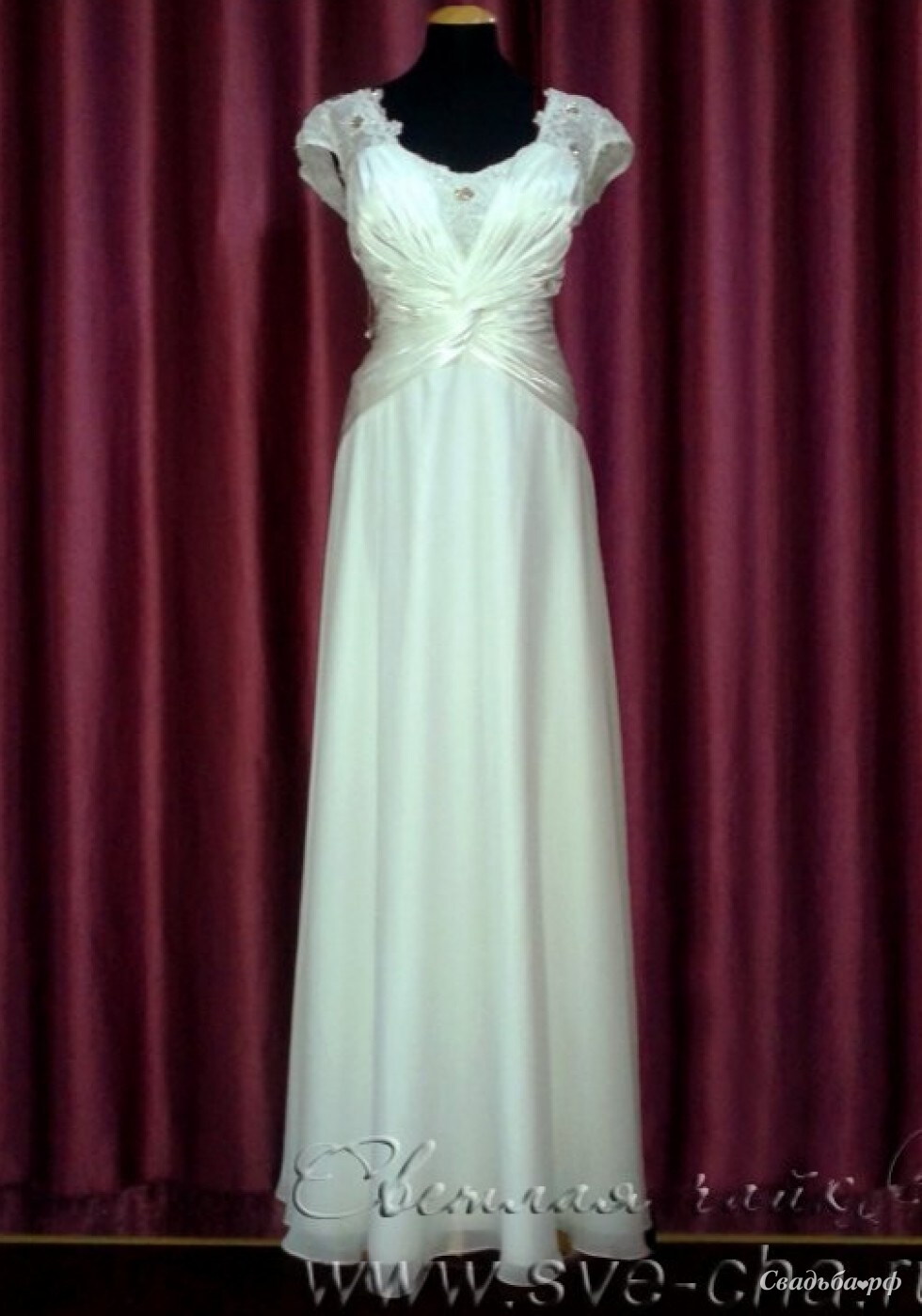 Необычное платье с красивым расшитым лифом и небольшими рукавчиками в виде крылышек. Сам корсет в районе талии удачно драпирован и скрывает недостатки, подчеркивая достоинства. Юбка прямая и летящая.