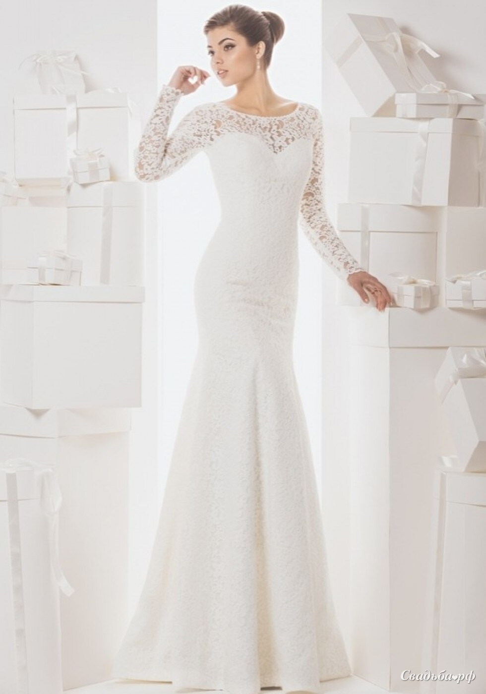 Свадебное платье Силуэта "русалка" сделано из кордового кружева с небольшим шлейфом и многочисленными пуговицами на полуоткрытой спинке. V-образный лиф переходит в кружевное декольте "лодочкой", хрупкие руки прикрывает длинный рукав до запястья. Стиль и индивидуальность — почерк данного платья.