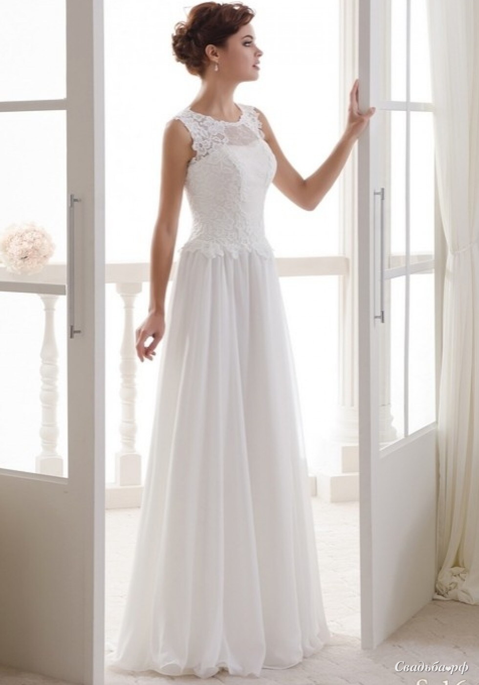 Свадебное платье с кружевным корсетом и легкой юбкой из летящего шифона формирует утонченный и женственный характер.
