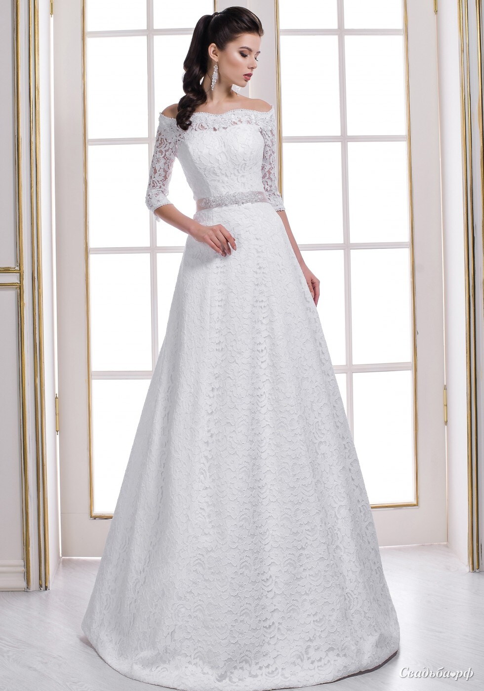 Кружевное свадебное платье А-силуэта с элегантными рукавами, раскрывающими оголенные плечи. Украшением и тонким намеком на роскошь данного силуэта служат перламутровые пуговицы на спинке и поясок бледно-розового цвета с брошью из камней Сваровски.