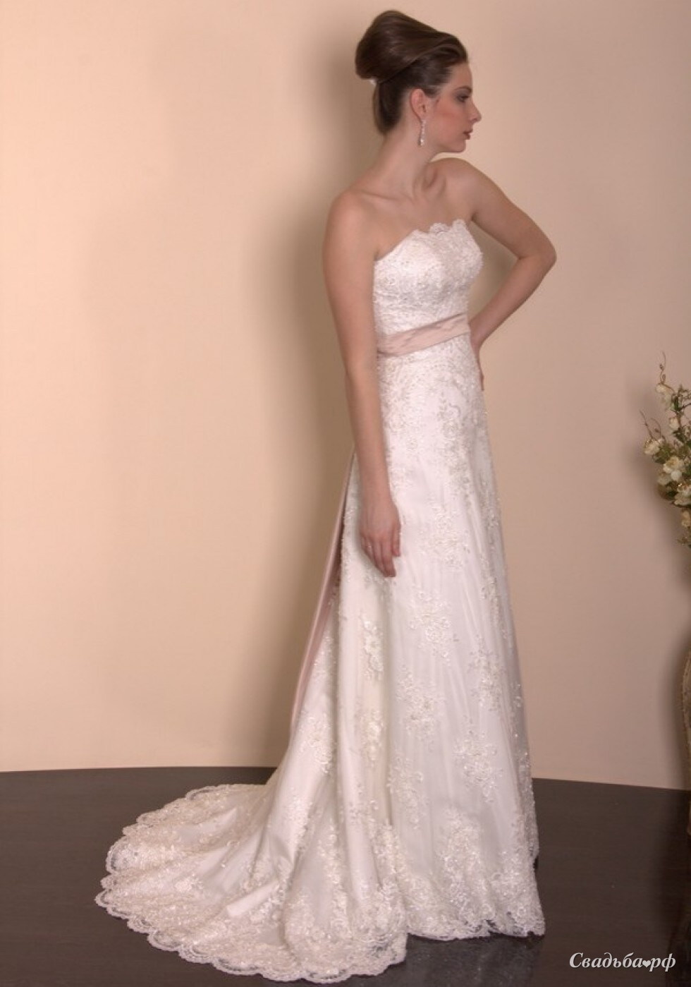 Свадебное платье А-силуэта с завышенной талией, оформленной атласным поясом цвета "пепельная роза", завязывающимся в крупный бант на спинке. Главной интригой и прелестью платья