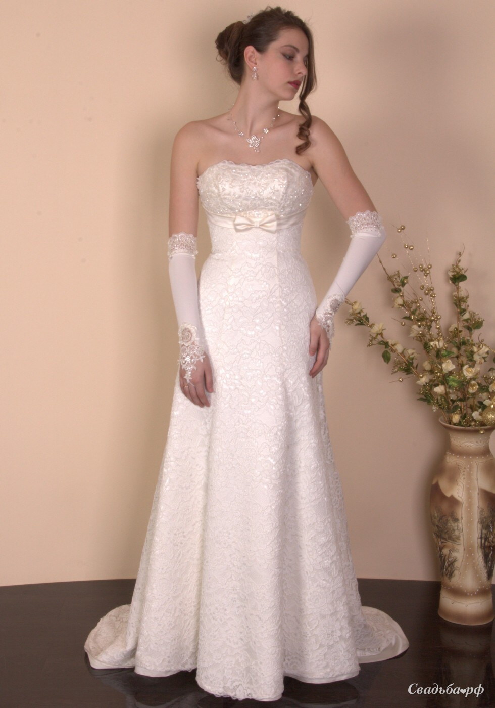 Бренд: Elena Solodkova. Силуэтное платье с открытым лифом в форме "лодочка", расшитым крупным бисером молочного цвета. Тонкий поясок под грудью украшает маленький бантик, зрительно делая талию еще тоньше. Прямая юбка переходит в небольшой и кокетливый шлейф.