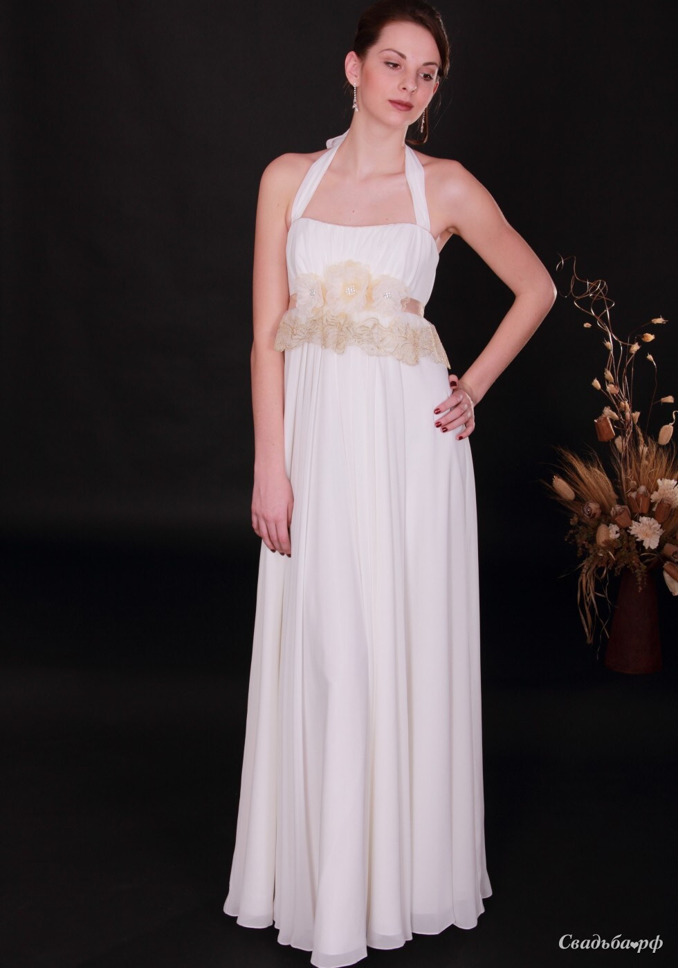 Бренд: Le Rina. Силуэт стиля Ампир. Шифоновое полотно платья оформлено подгрудным атласным золотистым поясам и золотым кружевом с кофейного цвета шелковыми цветами. Тонкие бретели помогут зафиксировать платье на нужной высоте.