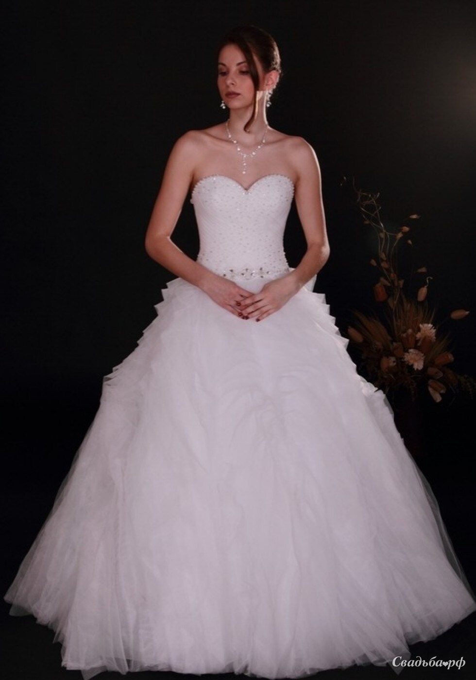 Пышное платье стиля принцессы. Корсет с V-образным вырезом, на котором расположены диагональные пересекающиеся драпировки. Корсет расшит многочисленными бусинами, бисером, стразами и пайетками, а по его низу выложен расшитый элемент кружева. Юбка платья выполнена из замысловатой дизайнерской фатиновой драпировки.