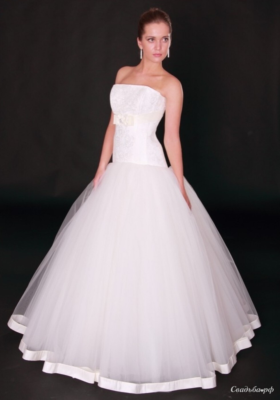 Бренд: Elena Solodkova. Пышное платье с удлинённым корсетом. Корсет выполнен из тонкого кружева, а под грудью расположена атласная лента, на которой располагается многофигурный бант с брошью в центре. Юбка из фатина многослойная, низ которой оформлен широкой атласной тесьмой.