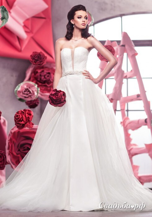 Свадебное платье-трансформер придётся по вкусу самым стильным и современным невестам. Гладкое платье с расшитым хрусталём корсетом и глубоким вырезом с полупрозрачной тканью привлекает внимание к бюсту. Поясок эффектно подчёркивает талию. Объёмный шлейф из фатина одевается отдельно. Длинная юбка струится до самого пола.