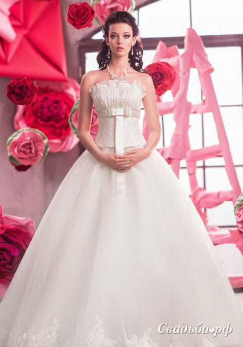 Роскошное свадебное платье с открытой зоной декольте и оригинальной драпировкой корсета никого не оставит равнодушным. Широкая лента под грудью и тончайшая вышивка ручной работы также украшают корсаж. Модель выгодно подчёркивает талию и зрительно увеличивает бюст. Пышная юбка из воздушного фатина придаёт образу лёгкость.