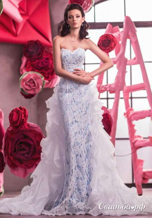 Потрясающее свадебное платье-трансформер с открытой зоной декольте и элегантным силуэтом придётся по вкусу самым стильным и практичным невестам. Облегающий наряд выполнен из плотного кружева и выгодно подчёркивает соблазнительные формы невесты. Дополнительно можно прикрепить шлейф с эффектными сборками из лёгкой ткани.