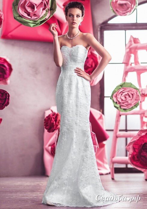 Воплощение элегантности и непревзойденного стиля. Кружево по всей длине платья полностью расшито бисером и пайетками. Фигурный лиф и корсет подчёркивают прелесть женских форм. Прямая юбка облегает бёдра и слегка расширяется книзу, давая возможность пофантазировать о красоте стройных ножек невесты и позавидовать жениху.