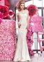 Белоснежное свадебное платье с полупрозрачной вставкой на груди и короткими рукавами никого не оставит равнодушным. Эта облегающая модель из нежного кружева эффектно подчёркивает все достоинства фигуры и мягко скрывает её недостатки. От середины бедра юбка слегка расширяется. Наряд зрительно вытягивает силуэт.