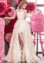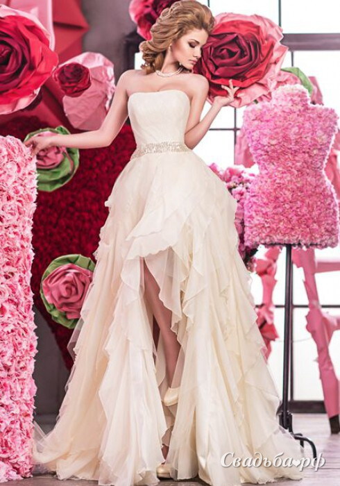За привычным словосочетанием свадебное платье на этот раз скрывается что-то новое. Невероятно нежная и воздушная юбка с вертикальными воланами дополнена оригинальным разрезом, обнажающим красивые ножки невесты. Элегантный корсет с открытой зоной декольте выгодно подчёркивает все достоинства фигуры. Широкий пояс вручную расшит стразами.