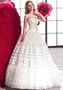 Эффектное свадебное платье с открытой зоной декольте создано для самых элегантных невест. Плотный корсет с оригинальными отворотами по верхнему краю привлекает внимание к бюсту и выгодно подчёркивает талию. Пышная юбка с многоярусными воланами декорирована горизонтальными полосами из более плотной ткани.