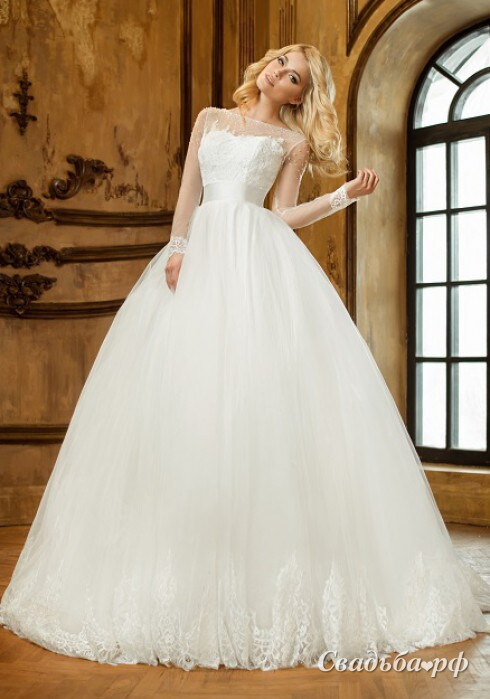 Диамант - пышное свадебное платье, декорированное нежным кружевом шантильи. Изящный корсет вручную расшит сверкающими хрусталиками. Линия талия подчеркнута атласным пояском. Вставка на груди и длинные рукава с манжетами выполнены из полупрозрачной ткани. Пышная юбка с ажурной окантовкой придаёт образу воздушность и праздничность.