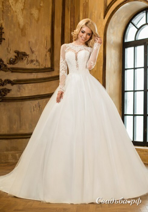 Корунд – это нежное и изящное свадебное платье из французского фатина. Оригинальный корсет декорирован узорами из вязаного кружева. Вставка на груди и длинные рукава выполнены из полупрозрачной ткани. Вырез-капелька на спинке придаёт образу игривость. Пышная сетчатая юбка завершается роскошным шлейфом. Почувствуйте себя настоящей феей!