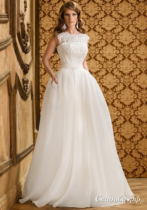 Восхитительное свадебное платье с широким поясом и закрытой зоной декольте поможет создать сногсшибательный образ современной королевы. Корсет декорирован тонким кружевом. Наряд выгодно подчёркивает осиную талию своей обладательницы. Пышная юбка из лёгкой ткани струится до самого пола. В таком свежем наряде Вы будете неотразимы!