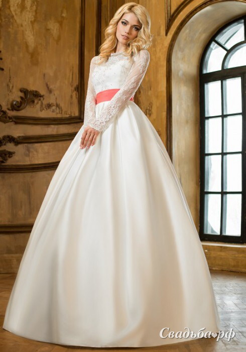 Циркон - романтичное свадебное платье А-силуэта с роскошным шлейфом. Изюминкой наряда является контрастный пояс с бантом на пояснице. Корсет украшен расшитым вручную кружевом с элегантным вырезом по спинке. Длинные рукава и закрытая зона декольте придают образу невинность. Пышная юбка поражает своими безупречными формами.