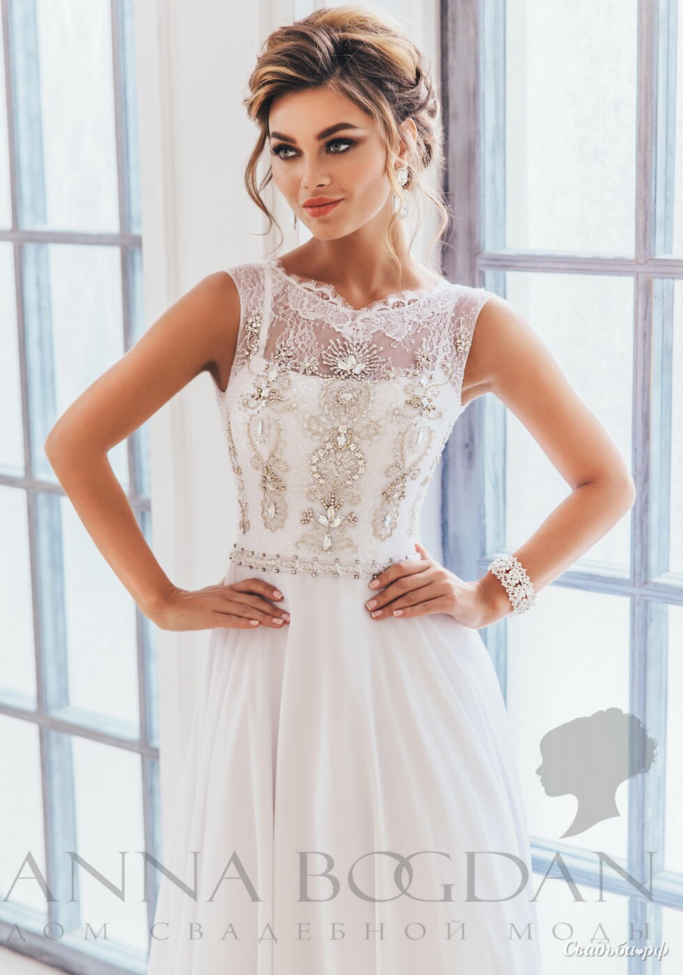 Роскошное легкое платье прямого силуэта. Кружевной изящный лиф декорирован вышивкой и кристаллами.
