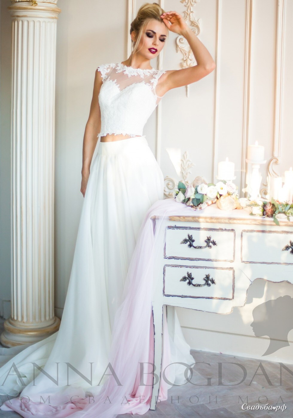 Современный свадебный наряд, состоящий из кружевного кроп-топа и гладкой юбки А-силуэта.