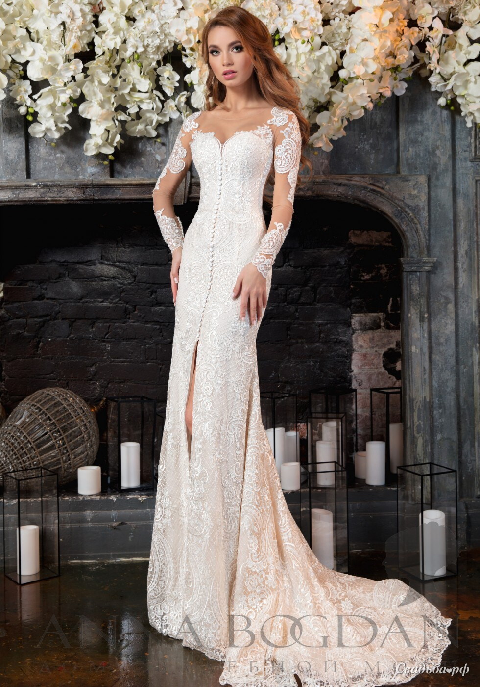 Для дам с миниатюрной и стройной фигурой отлично подойдет данная модель платья. Утонченности придает его дизайн, в котором преимущество остается за вертикальными линиями, вытянутыми кружевами и длинным шлейфом. Легкая, нежная и просто привлекательная ткань в сочетании с дизайнерской разработкой будет прекрасным выбором для леди, которая желает быть самой шикарной невестой в мире.