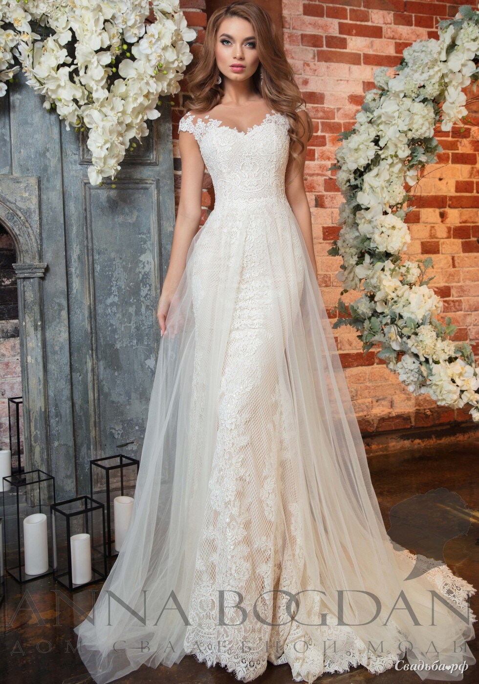 Облегающее платье с пышной верхней юбкой со шлейфом смотрится очень изящно и подойдет девушкам с любой фигурой, восхитительно подчеркивая талию. Декор в виде 3D цветов на корсете - это уникальная и очаровательная «изюминка» наряда, которая полностью дополняет образ, не требуя еще каких-либо деталей. Открытые плечи добавляют пикантности и завершают образ классической невесты.