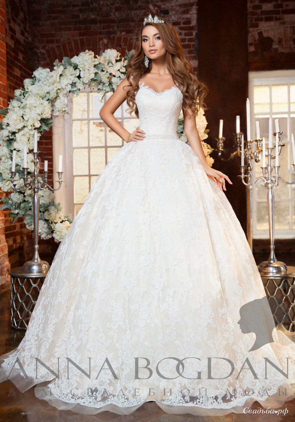 Пышное свадебное платье полностью выполнено из кордового кружева. Корсет декорирован поясом, расшитым вручную.