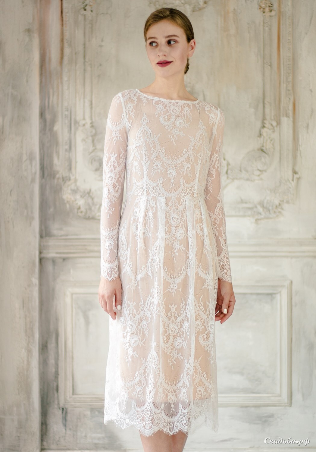 Особенностью кроя являются удлиненный рукав и длина миди юбки. Ощущение воздушности придает легкая сетка, украшенная нежным французским кружевом.