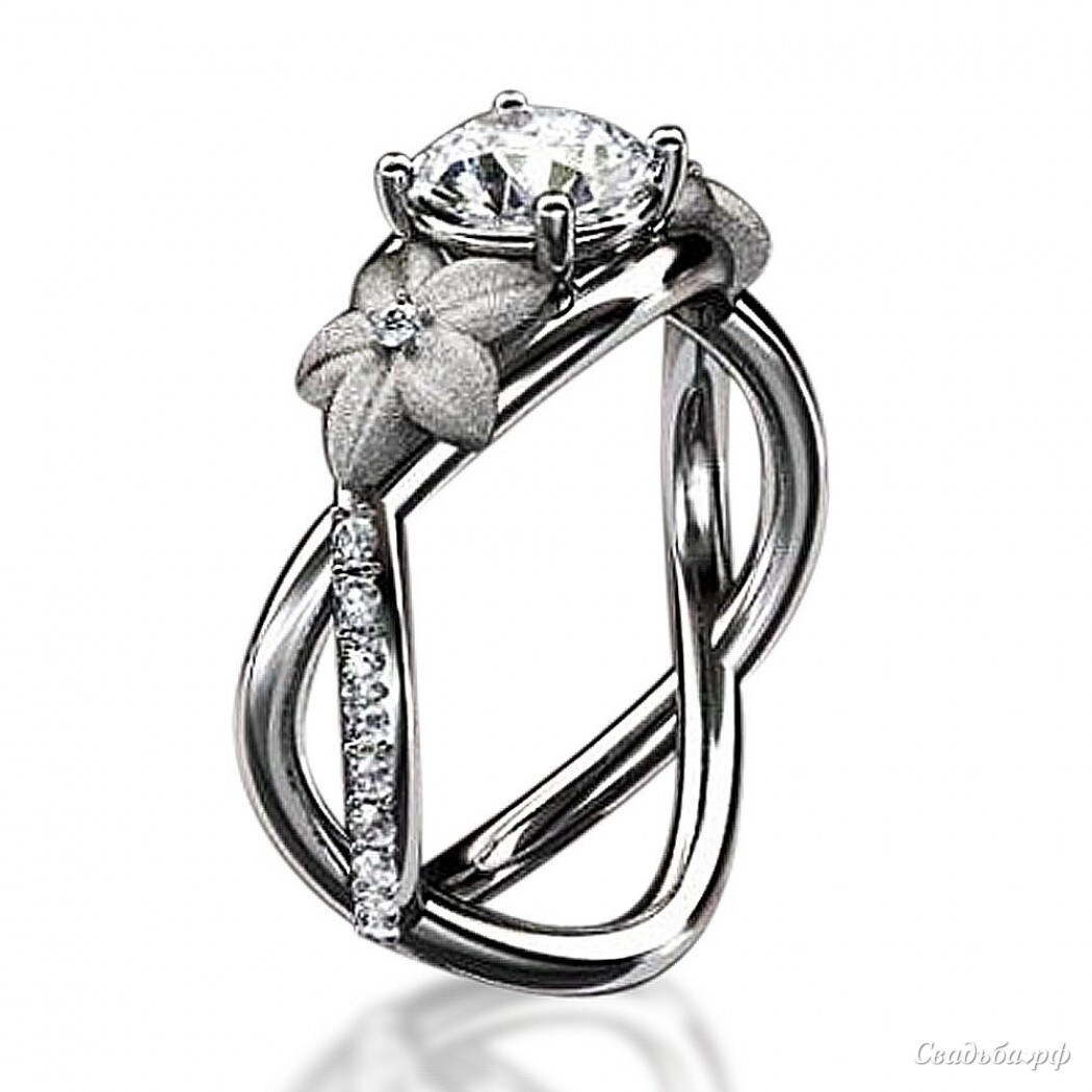 Помолвочное кольцо из белого золота декорировано крупным бриллиантом и объёмными цветами. Кольцо состоит из двух переплетённых между собой ободков.