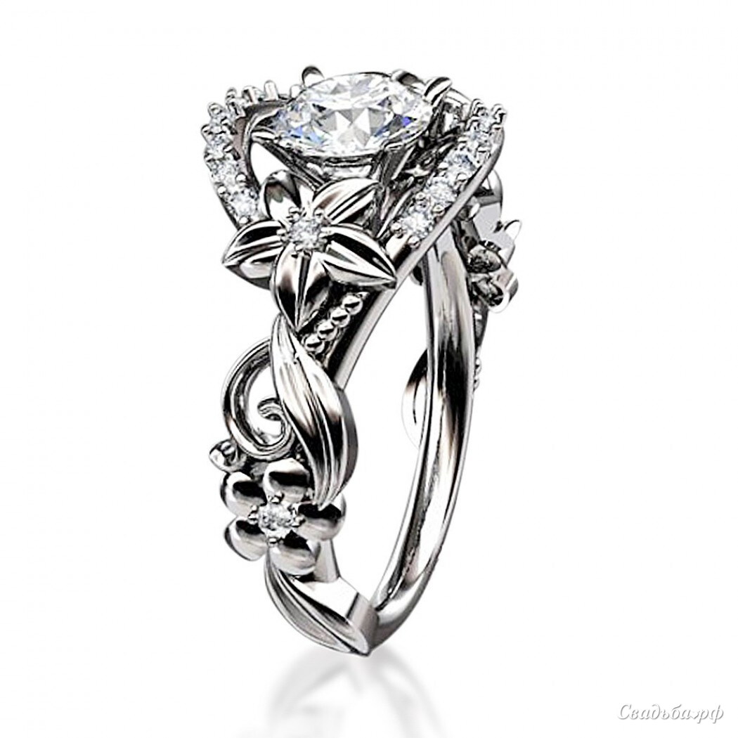 Оригинальное помолвочное кольцо из белого золота поражает своим тонким исполнением. Цветочное переплетение усыпано бриллиантами. Завершает картину огромный бриллиант в центре ободка.