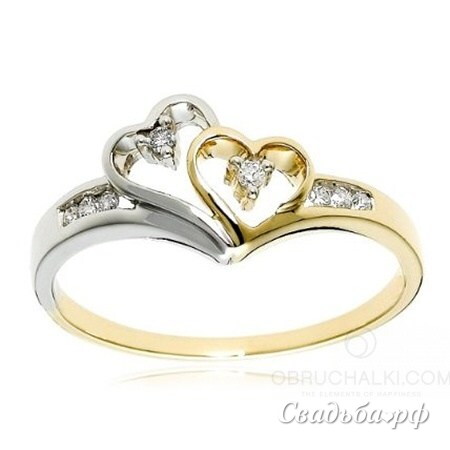 Эффектное помолвочное колечко из жёлтого и белого золота. Вставка в форме двух сердечек усыпана сверкающими бриллиантами. Кольцо символизирует вечную любовь.