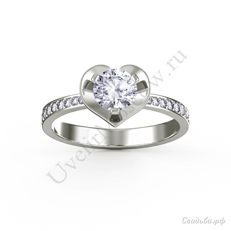 Очень романтическое кольцо для помолвки. Крупный бриллиант в 0,3 ct необычным креплением установлен в центре сердечка из белого золота. А восемнадцать бриллиантиков расположились по всему периметру изделия. Такое кольцо будет с гордостью передаваться из поколения в поколение и, несомненно, станет семейной реликвией.