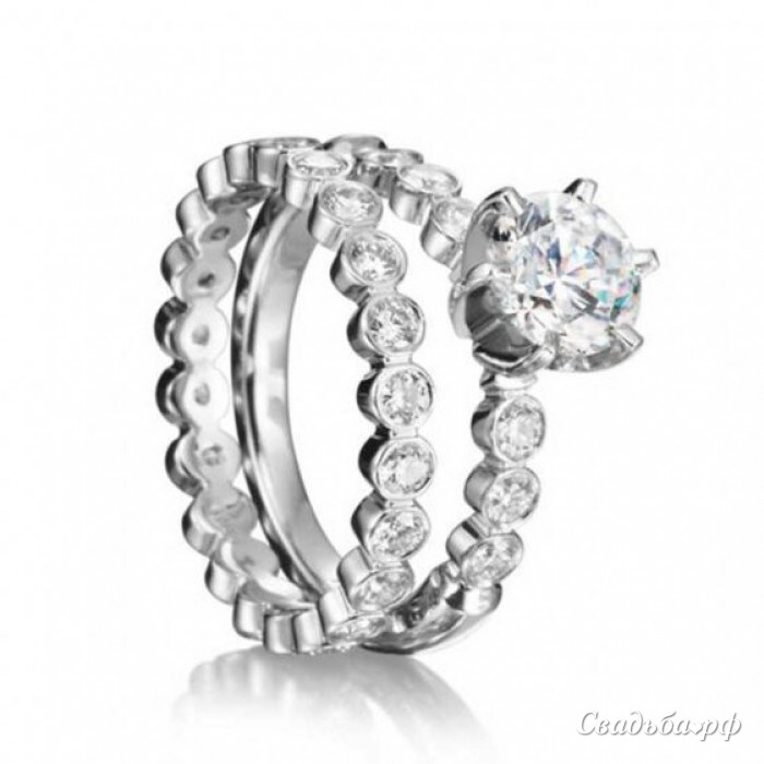 Роскошное обручальное кольцо представлено ведущими ювелирами России. Эта оригинальная модель выполнена из белого золота. Раздвоенный ободок усыпан сверкающими бриллиантами безупречной огранки. Изюминка кольца – это крупный камень, уютно расположившийся в искусной оправе. Кольцо приковывает к себе все взгляды окружающих.