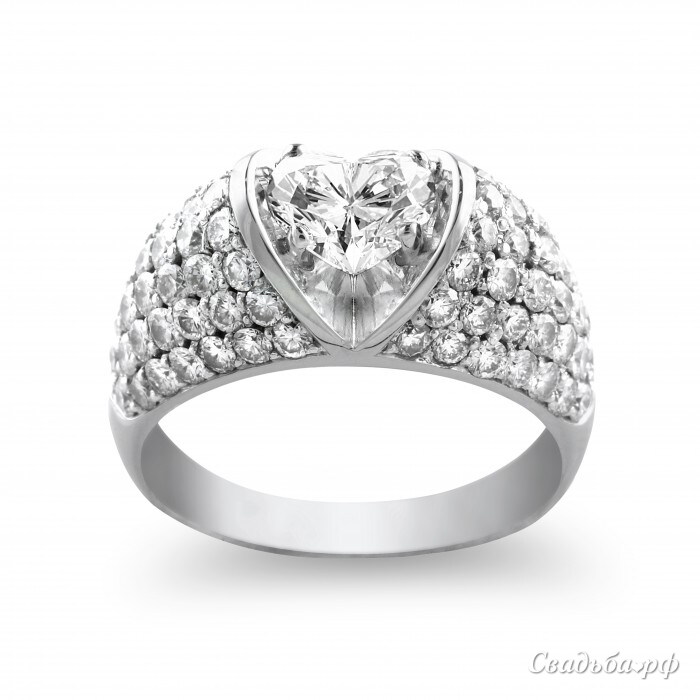 Мечтаете о королевском кольце? Тогда эта модель с массивным ободком и крупным сердечком придётся Вам по душе. Кольцо буквально усыпано сверкающими бриллиантами. В центре расположен самый крупный камень. Представленное кольцо может быть выполнено из желтого и белого золота, а также изменено по желанию будущего обладателя.