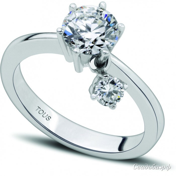 Оригинальное обручальное кольцо от лучших испанских ювелиров было бы обычным колечком, если бы ни дополнительная вставка бриллианта. Изящный ободок дополнен крупным камнем в искусной оправе. В одной из граней оправе приделана ещё одна миниатюрная оправа с камнем меньшего размера. Колечко смотрится стильно и романтично.