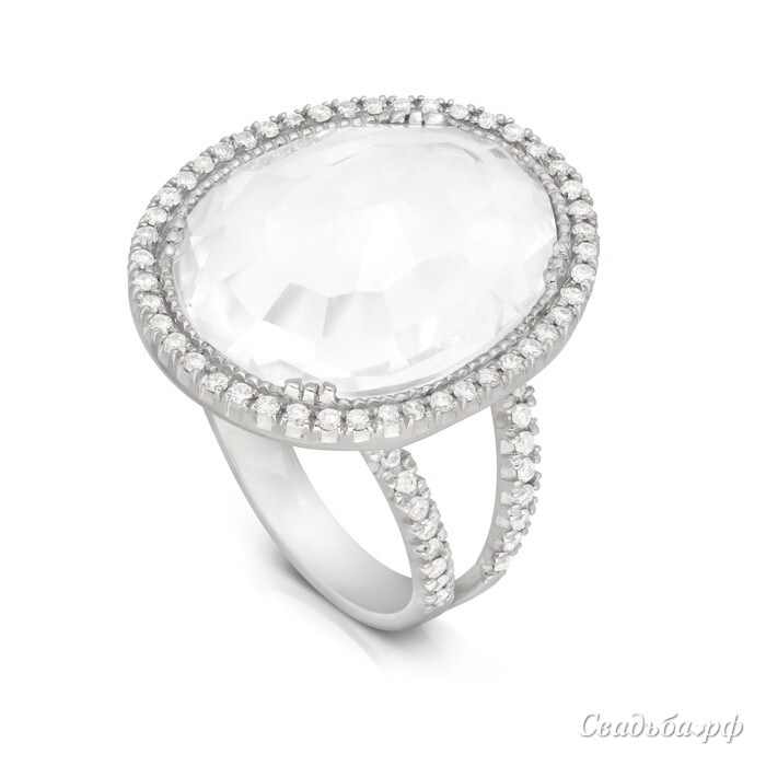 Поистине королевское обручальное кольцо выполнено испанскими мастерами из белого золота. Изящный ободок раздваивается с обеих сторон от массивной вставки. Крупный камень искусно закреплён в оправе и окружён дорожкой из миниатюрных бриллиантов. Ободок также украшен камнями. Кольцо переливается в лучах света и буквально ослепляет своим ярким блеском.