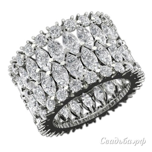 Эту модель кольца по праву следует назвать эксклюзивной. И это видно, как по его цене, так и по дизайну. Украшение широкое, выполнено из белого золота и по всему периметру инкрустировано крупными бриллиантами, так называемое кольцо вечности. Как правило, кольца вечности дарят на рождение ребенка или годовщину. Это кольцо точно не оставит никого равнодушным!