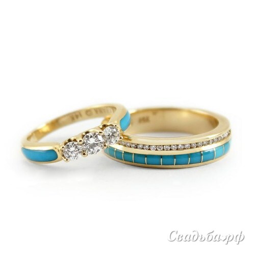 Классический вариант ювелирного "дуэта": обручальное и помолвочное кольца, выполненные в едином стиле. Оба украшения изготовлены из золота желтого цвета. По периметру помолвочного кольца проходит полоса из природного камня бирюзы. В центре украшение инкрустировано тремя крупными бриллиантами. Обручальное кольцо по всей окружности также украшено вставкой из бирюзы, а по верхней части ювелирного изделия проходит дорожка из небольших бриллиантов.