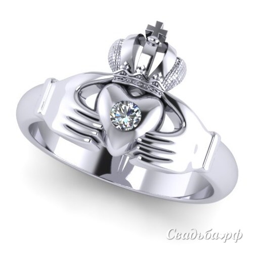 Вариант кладдахского кольца, такие кольца, символизирующие любовь, дружбу и преданность, являются традиционными кольцами для помолвки в Ирландии. Но сейчас распространены во всем мире. В представленном кольце Кладда сердце инкрустировано круглым бриллиантом, а основание короны украшено филигранью. Цена указана за изделие 16-го размера весом в 3,4 грамма.