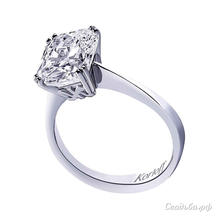 Великолепное обручальное кольцо из белого золота с одним крупным бриллиантом и логотипом Korloff на боковой грани. Бриллиант фирменной огранки Korloff Cut с 65 гранями, вместо обычных 57. Благодаря такой технике камень визуально выглядит крупнее и светится изнутри. Стоимость зависит от размера кольца, а также огранки и веса камня.
