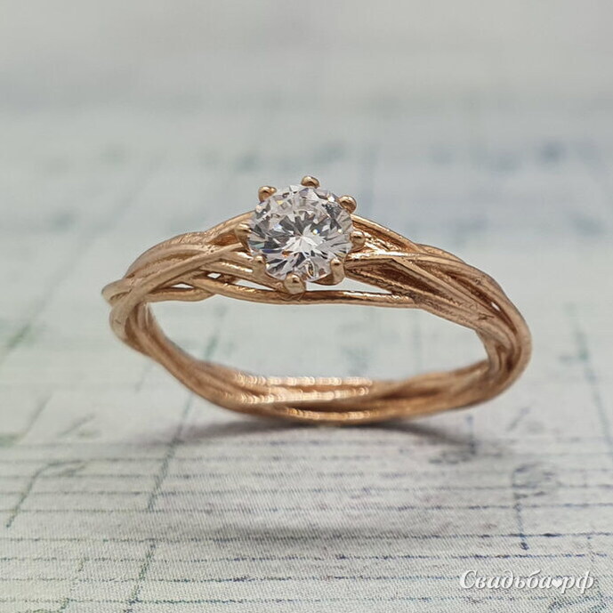 Кольцо с бриллиантом, кольцо веточка, кольцо из красного золота с одним камнем
