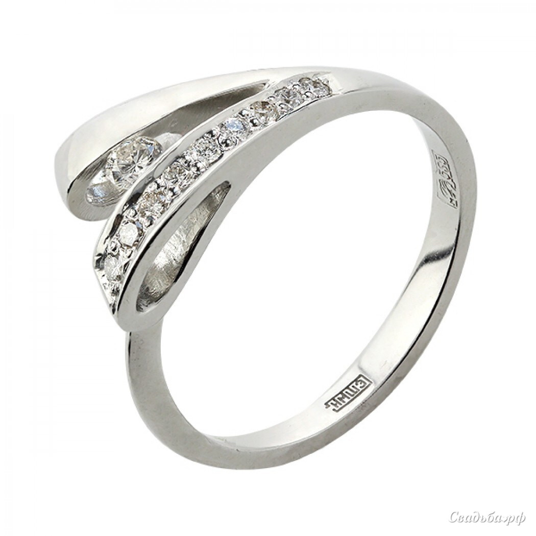 Ценителям самых стильных и качественных ювелирных украшений отечественного производства придётся по вкусу это помолвочное кольцо из белого золота. Изящный ободок дополнен вставкой необычной формы. Этот элемент усыпан бриллиантами безупречной огранки. Самый крупный драгоценный камень зафиксирован между двумя витками этой оправы.