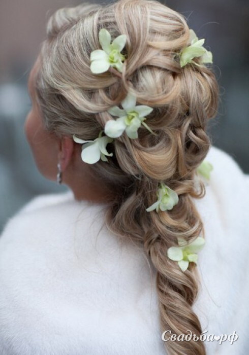 Создать романтический образ поможет эта свадебная прическа. Она подойдет, исключительно, обладательницам длинных волос, так как представляет собой уложенные локоны, плавно переходящие в хвост. Прическа будет отлично смотреться как с челкой, так и без нее. Декорировать прическу можно некрупными цветами в тон платья, это придаст образу нежность и воздушность.