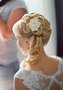 Интересный вариант свадебной прически - классический заниженный пучок декорирован прядками волос в оригинальную и необычную розочку. Эта прическа понравится девушкам, которые привыкли носить челку. Такая прическа будет замечательно смотреться со свадебным платьем с открытой или ажурной спинкой. Завершит образ невесты декоративный цветок в волосах.