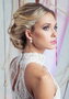 Такая прическа идеальна для свадебных нарядов в винтажном стиле с закрытой линией декольте, воротничком-стойкой и ажурной спинкой. Волосы по пробору убраны назад и заколоты в объемный заниженный пучок, но не строгий, а слегка небрежный с несколькими выпадающими прядками. Идеально подойдут сюда аккуратные серьги с крупным жемчугом.