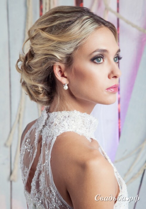 Такая прическа идеальна для свадебных нарядов в винтажном стиле с закрытой линией декольте, воротничком-стойкой и ажурной спинкой. Волосы по пробору убраны назад и заколоты в объемный заниженный пучок, но не строгий, а слегка небрежный с несколькими выпадающими прядками. Идеально подойдут сюда аккуратные серьги с крупным жемчугом.