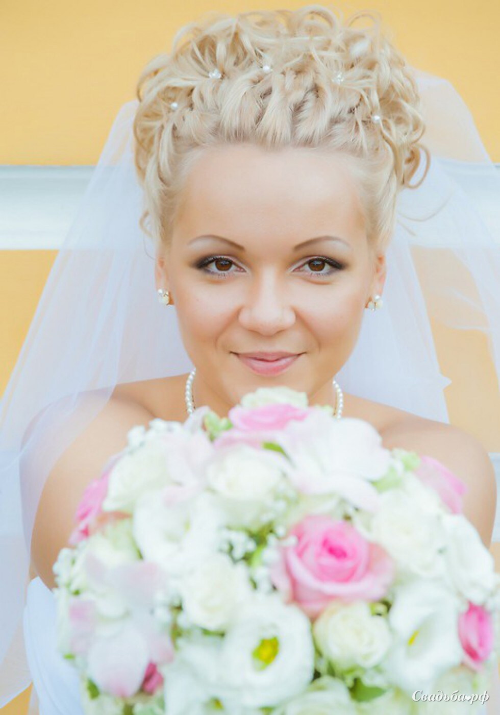 Прическа собрана из огромного количества жгутиков, и красиво уложена в объемный воздушный и легкий пучок. Украшена прическа отдельными шпильками с стразами, которые придают прическе дополнительное очарование!