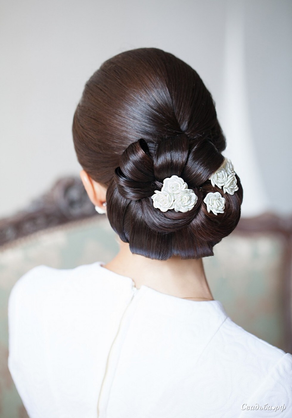 Классический низкий свадебный пучок украшен бантом из волос и цветами