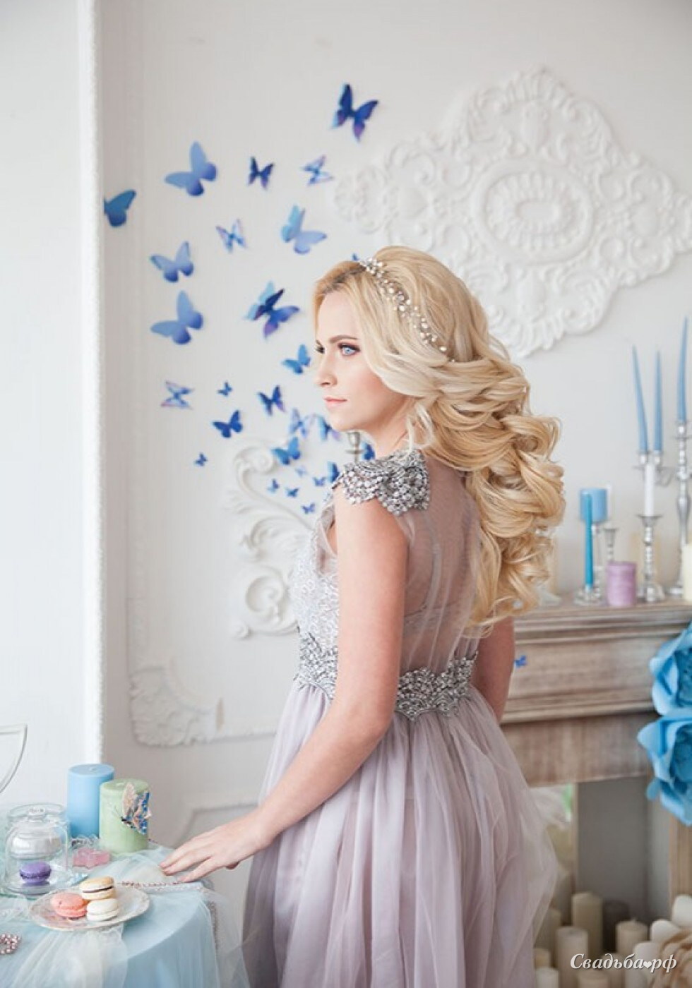 Крупные локоны собраны в греческую косу и украшены ободком-диадемой