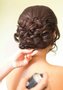 волосы чуть закрывают шею, не густые. пучок в сдержанном стиле.