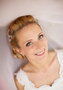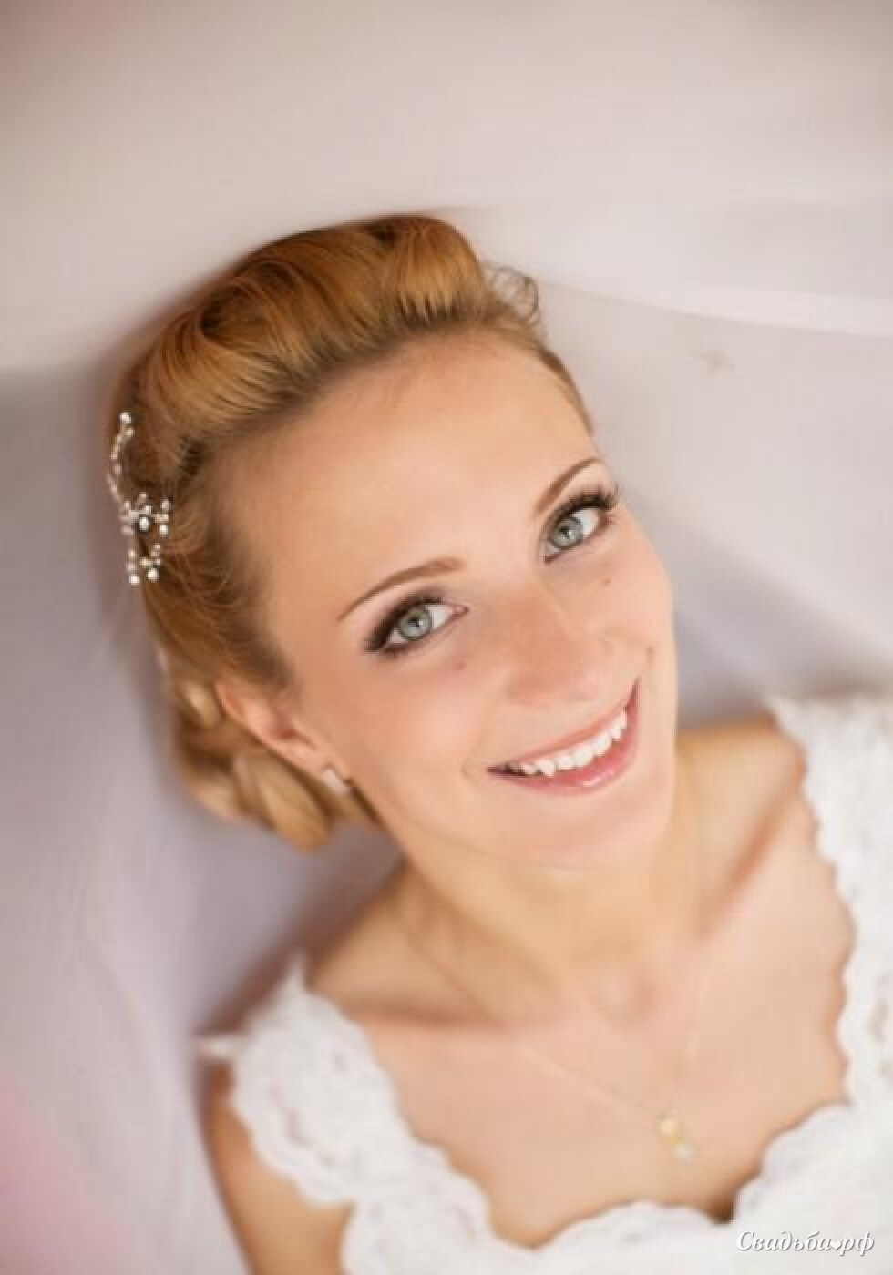 Для создания чистого, свежего и весеннего образа современной невесты нужен соответствующий макияж и свадебная причёска. Волосы убраны со лба и зафиксированы на затылке. Причёска дополнена переплетением локонов и сверкающей вставкой. Глаза эффектно подчёркнуты. Длинные реснички придают образу романтичность. Лёгкие тона и счастливая улыбка.