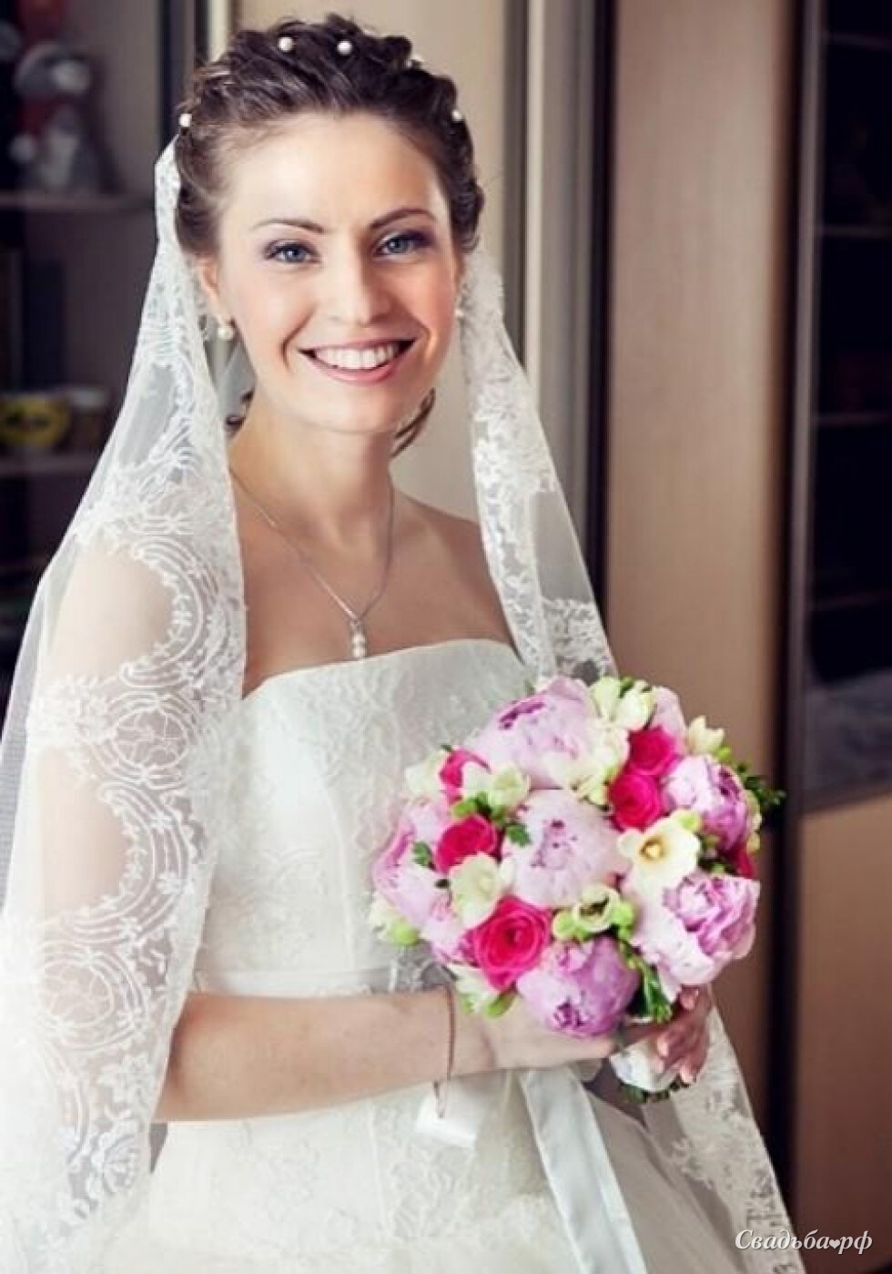 Свадебная причёска с фатой и открытым лбом акцентирует внимание на лице и шее невесты. Волосы зачёсаны назад и зафиксированы на затылке. Свободные локоны струится на спину. Эта достаточно объёмная укладка может быть украшена бусинами, сверкающими заколками или живыми цветами. Модель выполняется практически на любой длине волос.